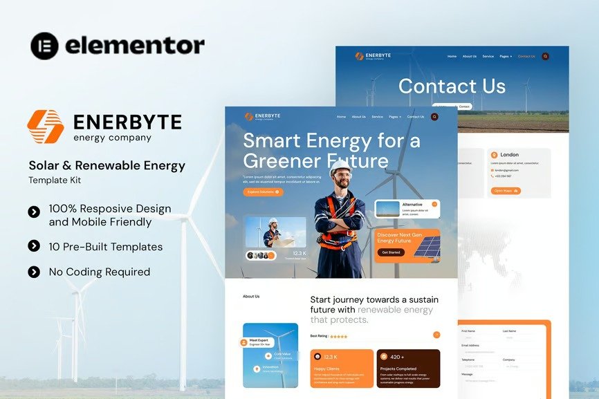 Enerbyte is a clean and powerful Elementor Template Kit designed for renewable energy companies, solar solution providers, and sustainable technology firms. Perfect for green energy startups, solar panel installers, and clean tech initiatives, this kit helps you showcase innovative solutions, highlight environmental impact, and present your services with clarity and professionalism. Enerbyte uses only free elements—so you can explore, customize, and launch your site with confidence and ease! Enerbyte provides various pages including Home, About Us, Service, Our Team, Project, Pricing, FAQ, Blog, 404, Contact Us.