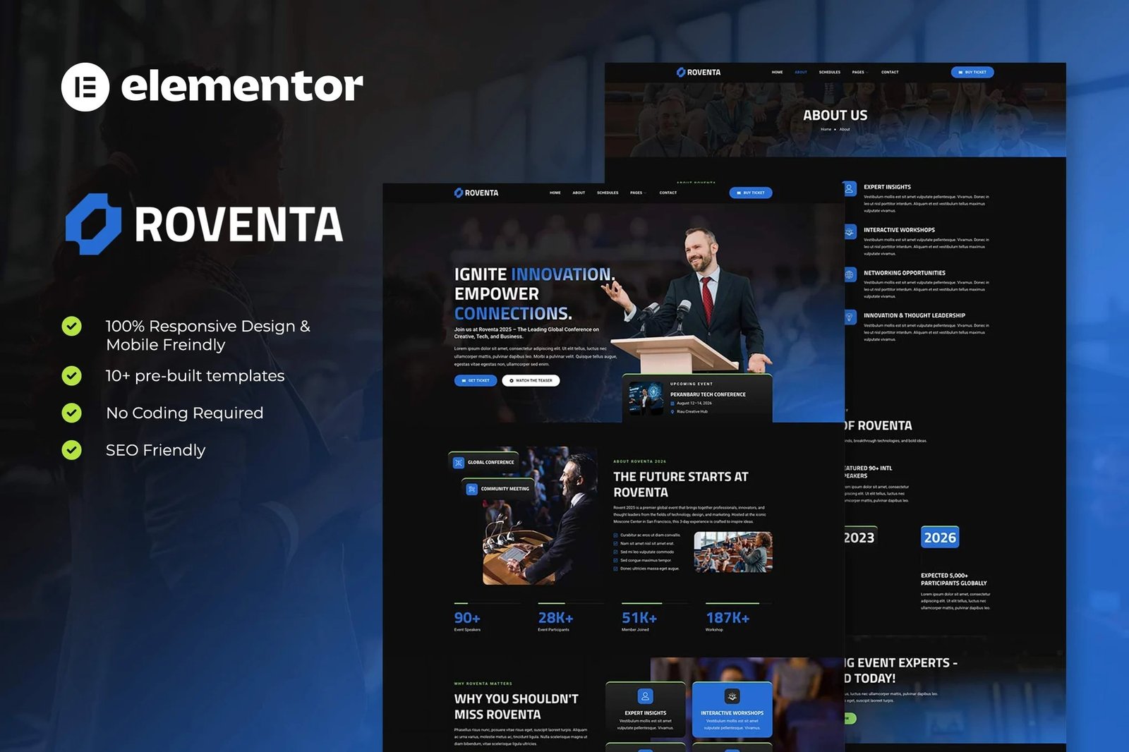 Roventa is a modern and powerful Elementor Template Kit designed for organizing, promoting, and managing professional event, conference, seminar, meetup, summit, webinar, or any business gathering. Built with a clean and stylish design, Rovent offers everything you need to create a stunning landing page or full-featured event website — without writing a single line of code.