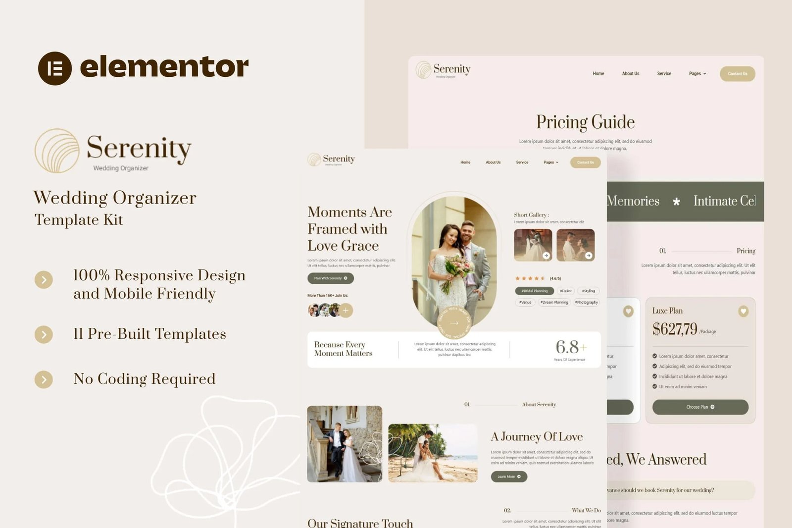 Serenity is an Elementor Template Kit designed for wedding organizers and celebration planners. It?s perfect for event stylists, wedding coordinators, and businesses seeking to craft unforgettable moments with elegance and grace. Serenity is built using free elements, making it accessible and easy to customize for any user. Serenity provides various pages including Home, About Us, Service, Team, Pricing, Project, FAQ?s, Testimonial, Blog, 404, Contact Us.
