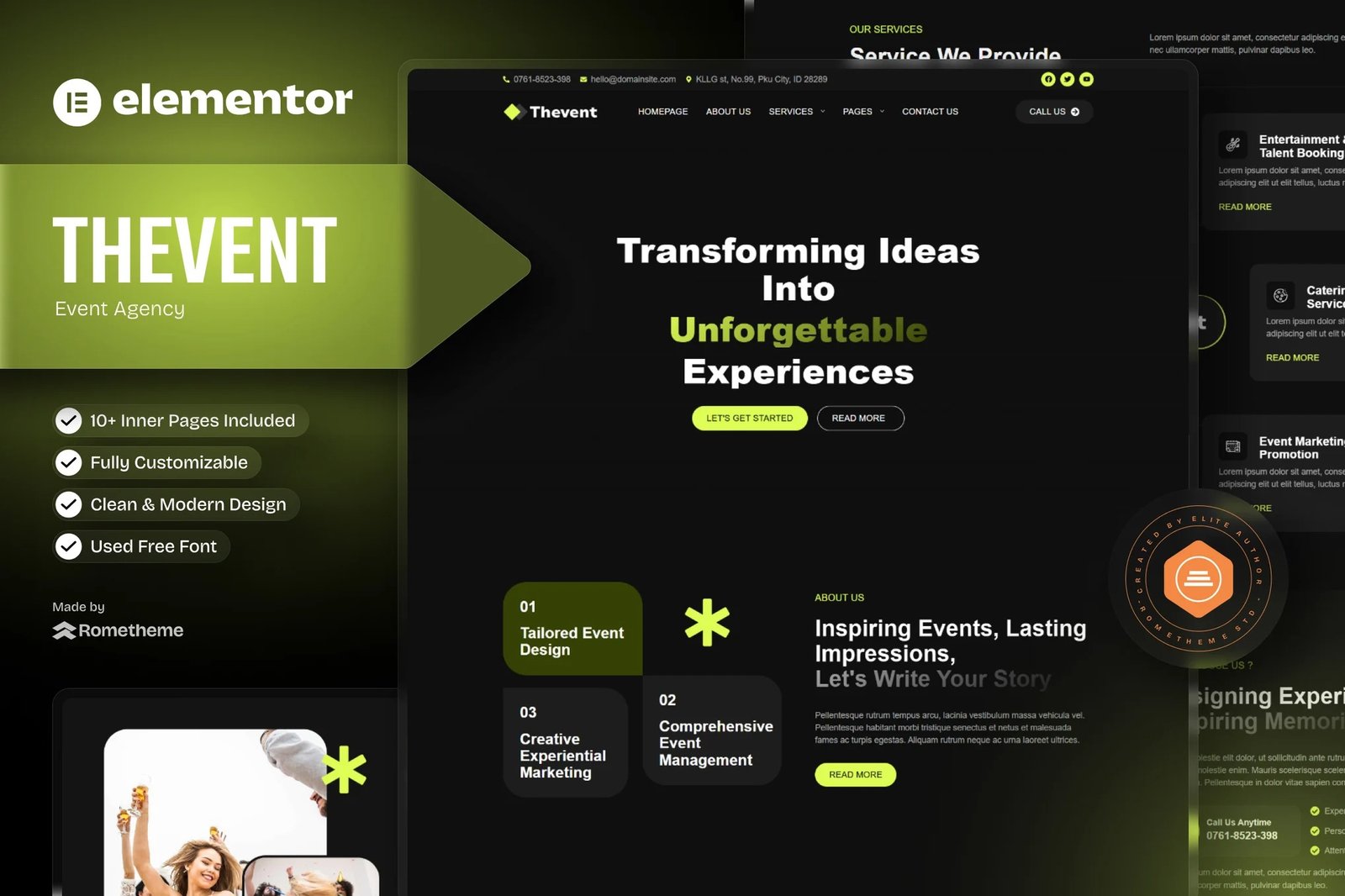The template kit comes with an ideal selection of templates for Event Agency, Event Planner, Event Organizer, Event Service, Event Manager, Event Supporter, Event Company, and anything related to Events or Creative Agency. This kit has a modern and unique design with a 100% fully responsive layout, easy installation, and sure very easy to customize because using Elementor so you don’t need a single line of coding!