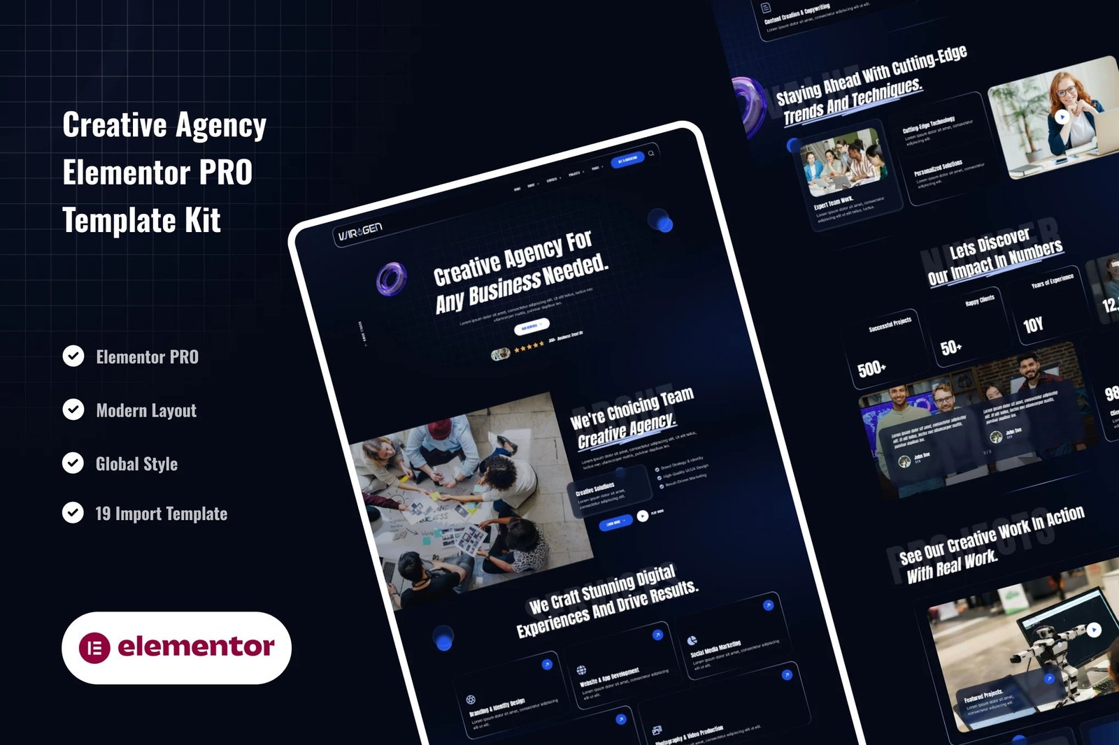 Wiragen ? Creative Agency Elementor Pro Template Kit is a collection of layouts for the Elementor page builder WordPress plugin, designed for use with Elementor Pro for a modern and stylish design. It works with most themes and is optimized for use with the Hello Elementor theme.